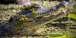 Emerging from a stagnant lake overgrown with duckweed, this Spectacled Caiman takes a quick breather before then disappearing once more underwater where it'll remain undetected.